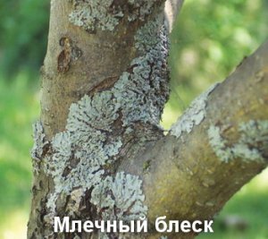 Основной симптом — пораженный участок становится молочного, серебристого цвета с характерным перламутровым блеском. Больные млечным блеском ветви перестают плодоносить. Фрукты слабо развиваются, осыпаются, а ветви через несколько сезонов засохнут и отомрут. Проявляется эта болезнь в разгар лета, в середине июля. Начинается с поражения нескольких ветвей, но быстро распространяется по стволу и приводит к нежизнеспособности скелетных ветвей, а иногда может привести к гибели всей яблони.