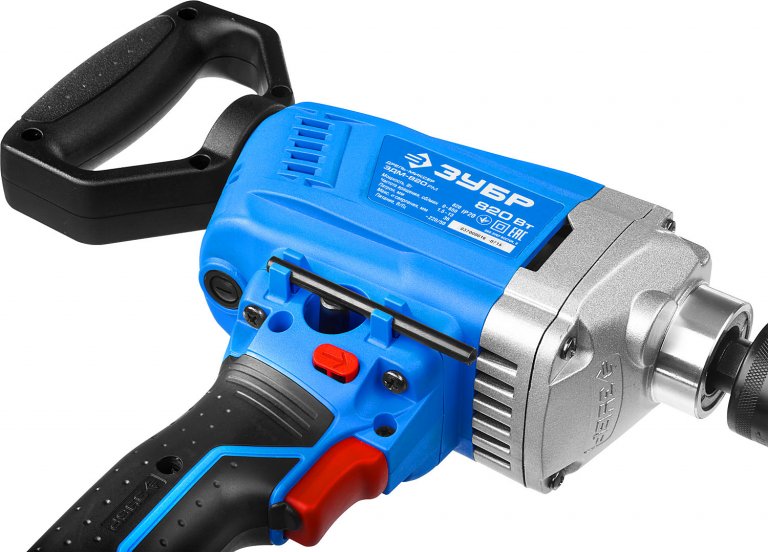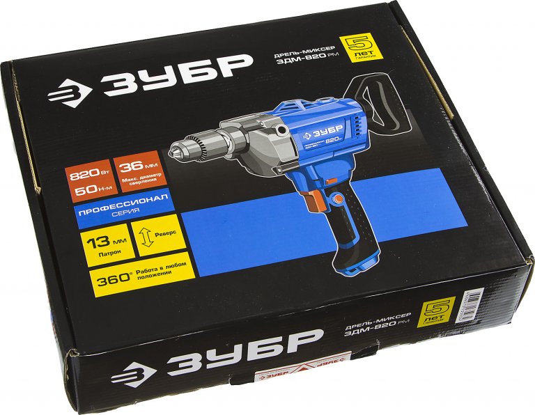 Дрель-миксер ЗДМ-820 РМ являет собой образец сочетания компактности и высокой производительности. Инструмент, масса которого составляет лишь 3 кг, характеризуется мощностью 820 Вт, и обеспечивает крутящий момент 50 Н·м. С помощью устройства вы сможете размешивать различные растворы и сверлить отверстия, диаметр которых может достигать 36 мм. ЗДМ-820 РМ оснащена функцией реверса, и позволяет регулировать рабочие обороты. В комплектацию инструмента, упакованного в коробку презентабельного вида, входят дополнительная рукоятка и ключ патрона.