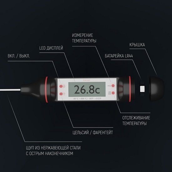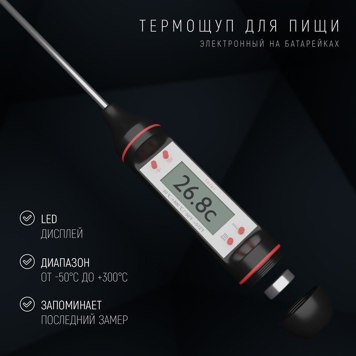 Многофункциональный электронный термощуп — современный прибор, состоящий из иглы и измерительного блока с ЖК-дисплеем. С ним вы легко узнаете температуру и степень готовности мяса, птицы, рыбы, выпечки и других продуктов.