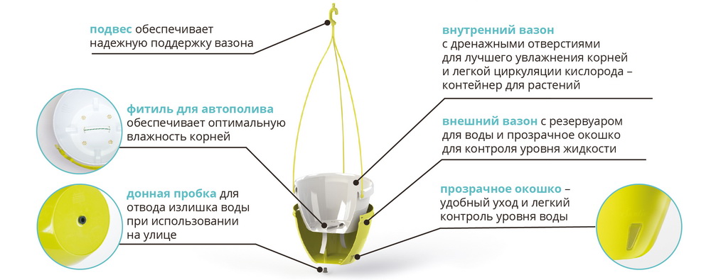 Подвесные вазоны VISTA обеспечивают великолепный рост растений. Вы легко можете контролировать наличие воды в резервуаре по индикатору уровня воды, установленному в вазоне.