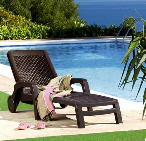 - Стиль. Шезлонг прекрасно впишется в декор Вашего дачного участка, а также станет прекрасным завершением ансамбля уличной мебели из пластика под искусственный ротанг. Шезлонг также поможет создать атмосферу уюта перед бассейном в SPA зоне.