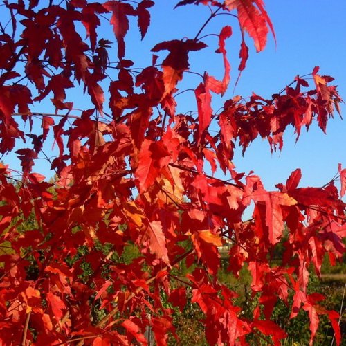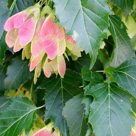Листья темно-зеленые, трехлопастные, блестящие, снизу с редкими волосками. Осенью листья приобретают оттенки от оранжевого до огненно-красного. Цветки желтоватые, душистые в густых многоцветковых метелках, распускаются после развертывания листьев. Крылатки зеленые или ярко-красные.