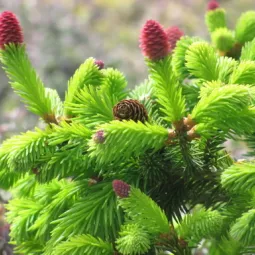 - «Акрокона»: характерной чертой сорта являются большие шишки с красной весенней окраской, которые располагаются на концах побегов. Этот сорт рекомендуют для японских, небольших приусадебных садов.