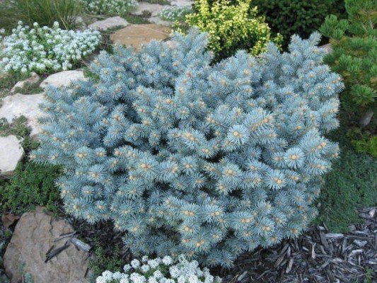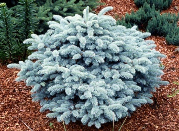 Карликовая ширококоническая форма ели колючей, в течение нескольких лет полушаровидная и без чёткого ствола, в возрасте 30 лет достигающая свыше 3 м. высотой и более 2-3 метров в диаметре. Побеги короткие, жёсткие, хвоя серебристо-голубая, колючая. Неприхотливая, очень красивая ель.
