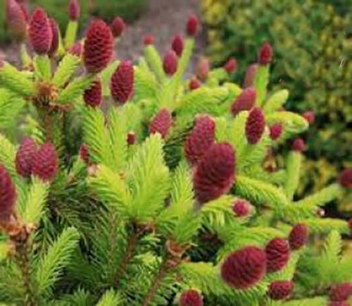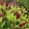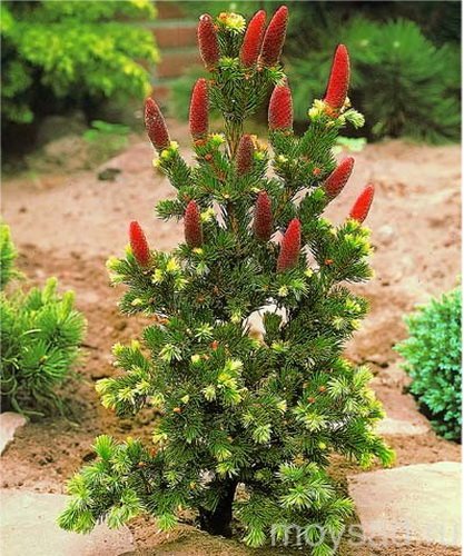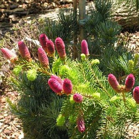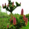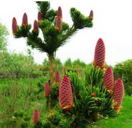 Отличается низким ростом, нерегулярной, компактной формой кроны, зеленой хвоей и молодыми приростами салатового цвета. А также крупными лилово-красными шишками.