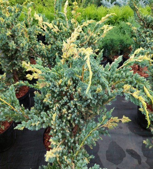 Медленнорастущий кустарник с вариегатной хвоей. Пестролистный аналог шикарного, очень популярного сорта 'Meyeri'.