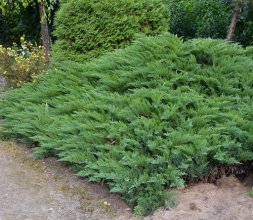 Это невысокий, карликовый кустарник с лежащими побегами – всего 40-50 см в высоту. Быстро разрастается в ширину, достигая в диаметре 4-х метров. Как и другие виды можжевельников, хорошо поддается стрижке, поэтому его высаживают в качестве живой ограды, придавая кроне аккуратную форму.