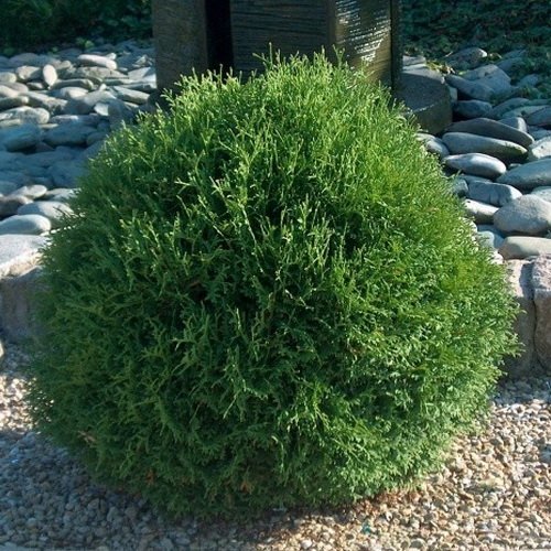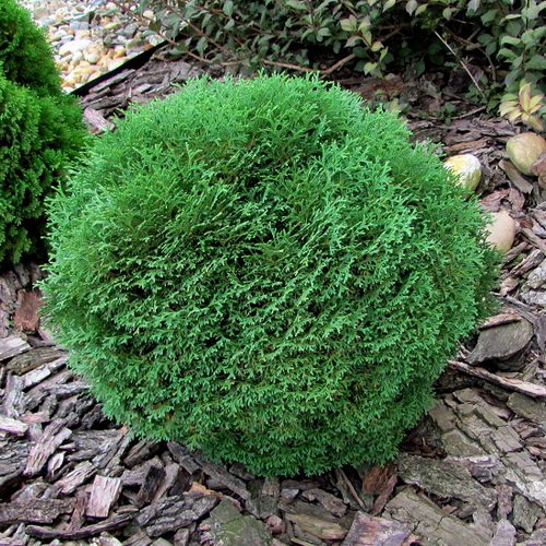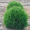 Туя западная Тини Тим – очень медленно растущий, карликовый вечнозеленый кустарник с шаровидной кроной. Высота взрослого растения редко превышает 40 см, диаметр у кроны равен или чуть больше высоты. Хвоя густая, темно-зеленая.