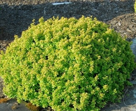 Изящный, миниатюрный кустарник. Высота и диаметр кроны куста до 0,5 метра. Крона шаровидная, компактная. Кора красновато-коричневая. Побеги короткие, с изгибами, со светло-коричневой корой и острыми шипами.