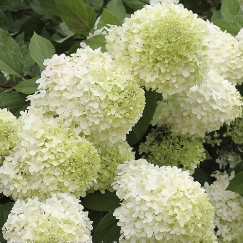 Цветение непрерывно с июля по сентябрь. Широкопирамидальные, очень крупные соцветия (25-30 см), состоящие практически из стерильных цветков, в начале цветения зеленоватые в тени (цвета лайма), на солнце - чисто белые, в конце цветения розовеют.