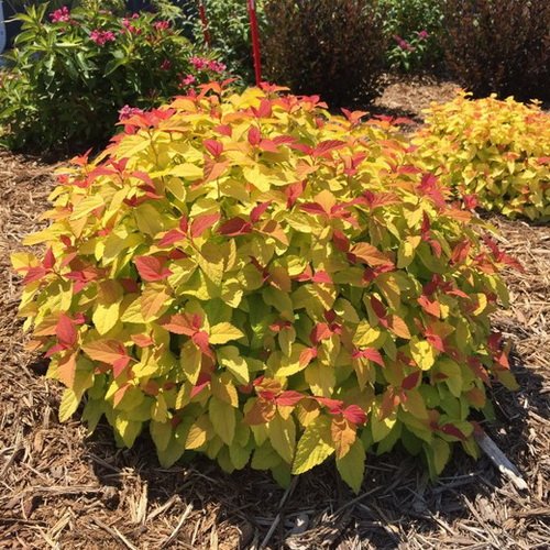 Красивый плотный кустарник высотой до 0,6 — 0,8 м., диаметром до 1 м. с молодыми листьями оранжево-красного или бронзово-золотистого цвета. Затем они становятся ярко-желтыми, потом желто-зелеными на момент цветения. После цветения огненные краски листвы возвращаются. Отличается многократным изменением оттенков желтой окраски листвы в течение сезона. Осенняя окраска листьев — медно-оранжевого с золотом (на кислых почвах — ярче, добавляется пурпурный цвет). Иногда на кусте появляются пестрые листья. Листья продолговатые, по краю зубчатые, 5-8 см. длиной. Цветки мелкие, ярко-розовые, собранные в щитках. Период цветения: конец июня – середина августа, средняя продолжительность цветения – 50 дней, цветение обильное.