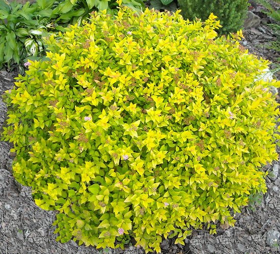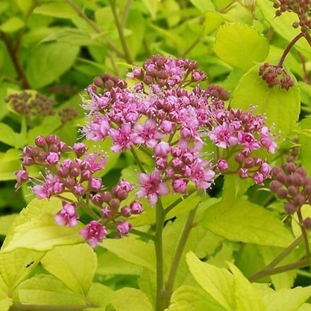 Низкорослый декоративный лиственный кустарник, высотой до 60 см. и диаметром кроны - до 1 м. Растёт медленно. Подушковидная крона. Листья - продолговато-яйцевидные, по цвету летом: от золотисто-жёлтых (если растение высажено на солнечном месте) до салатовых (если растёт в полутени или тени); осенью листья приобретают оранжево-красноватый оттенок. Цветёт в июне - август. Цветки - розовые, мелкие; собраны в щитковидные соцветия, расположенные на побегах текущего года. Плоды - мелкие листовки - созревают в конце сентября - октябре.
