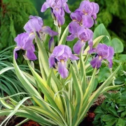 - ирис Джеральд Дарби – необычный сорт, с ярко-фиолетовой листвой, и сине-фиолетовыми цветами с желтыми язычками. Разводят и выращивают его так же, как ирис сибирский.