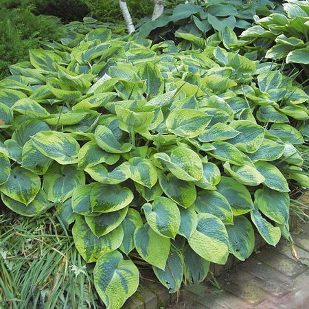 Хоста Токудама Флавоцирциналис - необычайно элегантная хоста с текстурированными листьями. Потрясающий контраст морозных сине-зеленых листьев и широкой золотисто-зеленой каймой.