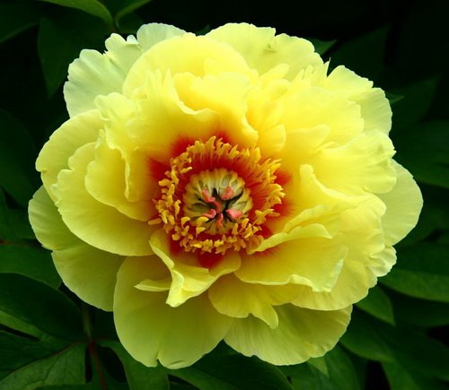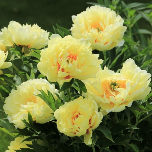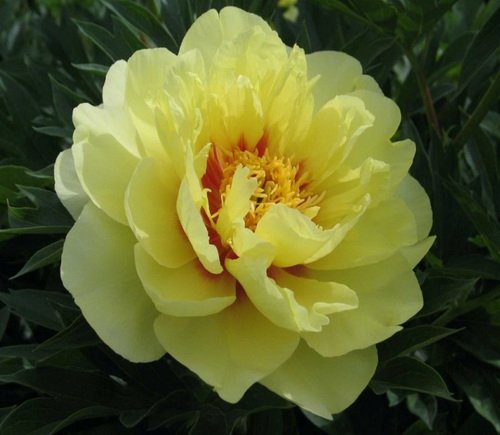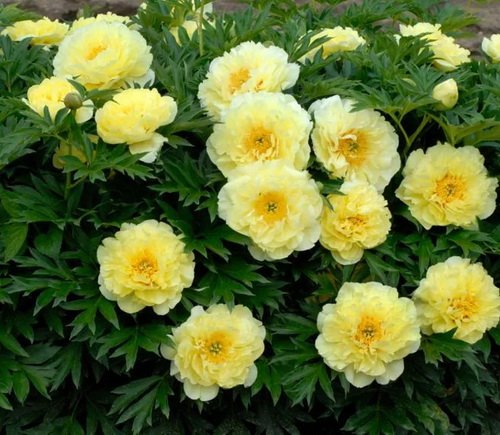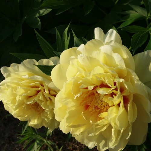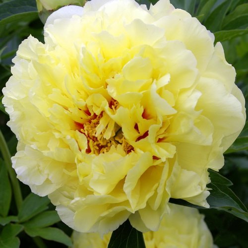 Пион ИТО-гибрид Бартзелла - цветки крупные, махровые, диаметром 20-25 см. Соцветия пышные желтого цвета c красными штрихами у основания лепестков. Они имеют приятный, но ненавязчивый аромат.