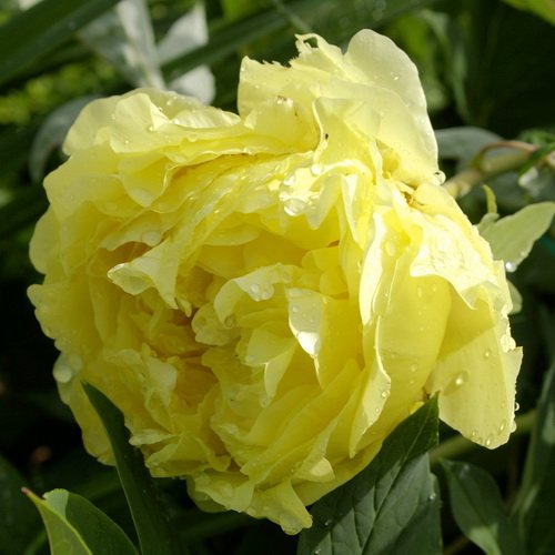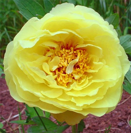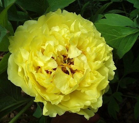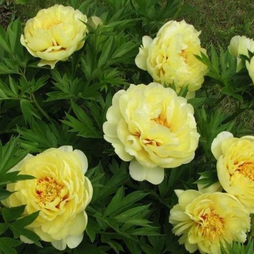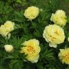 Пион Йеллоу Краун - цветки ярко-желтые с красными пятнами у основания лепестков, махровые или полумахровые, диаметром 20-22 см. Ароматный. Стебли прочные. Куст невысокий 60-65 см. Цветение обильное в середине сезона.
