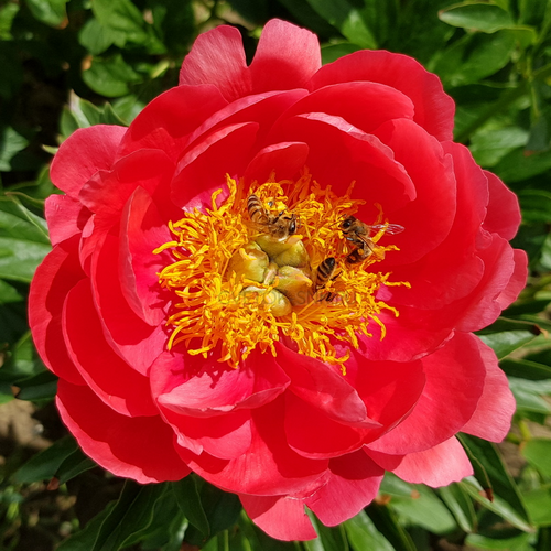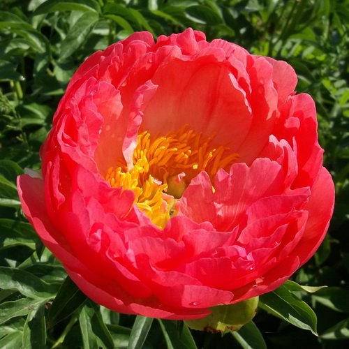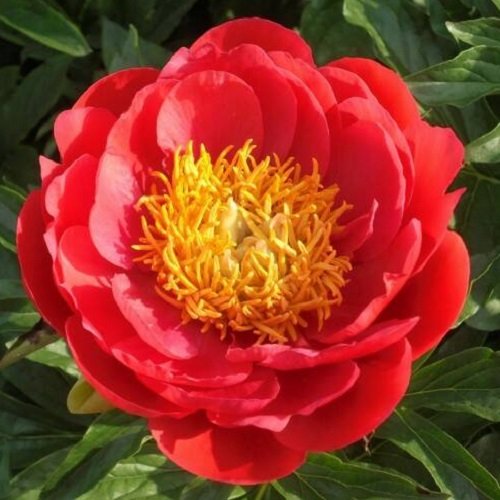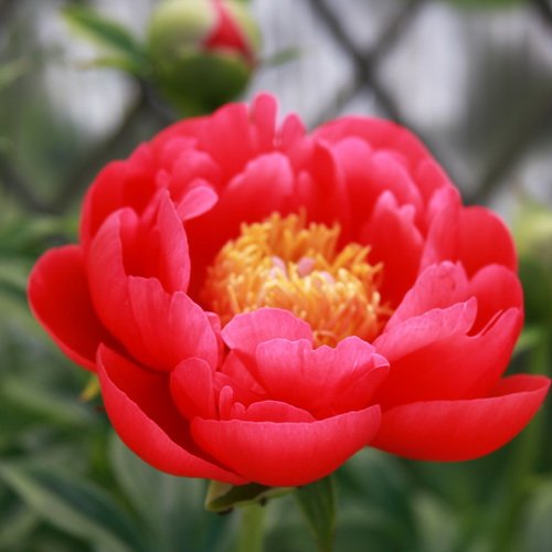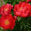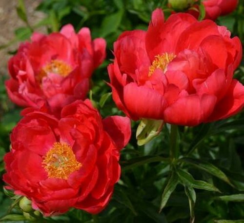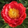 Пион гибридный Корал Мэджик - цветки полумахровые, чашевидной формы с тремя рядами лепестков. Очень красивая, яркая красно-коралловая окраска. В серединке расположены желтые тычинки.  Диаметр цветка 16 см.