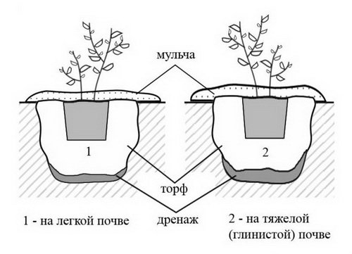 Сначала необходимо выкопать посадочную яму: неглубокую 40-50 см, но широкую -1х1,2 метра, с рыхлым дном, чтобы избежать застоя воды.