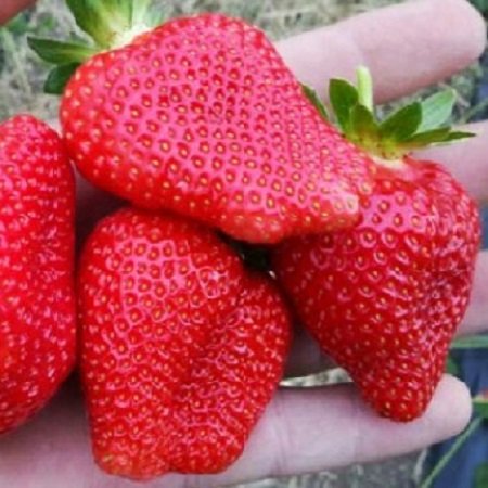 Плоды земляники имеют правильную форму, немного удлинённые и одномерные, что делает их весьма привлекательными. Особую роль здесь также играет неповторимый сочный и сладкий вкус с небольшими нотками кислинки, что придает такому виду особенность и изысканность. Растёт такая клубника мощным кустарником высотой около 30 см.