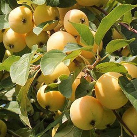 Максимальная масса яблок молодых яблонь 50- 60 грамм, а у взрослых деревьев и того меньше – 40 грамм. Кожура желтого цвета, с небольшими зелёными вкраплениями у незрелых плодов, а поспевшие яблочки имеют желтый цвет с розовеньким румянцем от солнца.