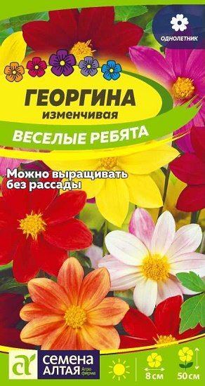 Эта компактная садовая георгина, высотой 30-60 см, будет радовать Вас своими яркими цветами с июля до заморозков. Цветки собраны в крупные немахровые соцветия-корзинки, в которых вся середина занята трубчатыми цветками и только по внешней окружности расположены в один ряд ложноязычковые цветки , разнообразных ярких окрасок. Лепестки имеют овальную форму. Однолетняя георгина не менее привлекательна своих многолетних родственников, но при этом требует значительно меньше трудозатрат. Растение свето- и теплолюбиво. Применяется в свободных композициях и групповых посадках. Пригодны для создания рабаток, бордюров, массивов
