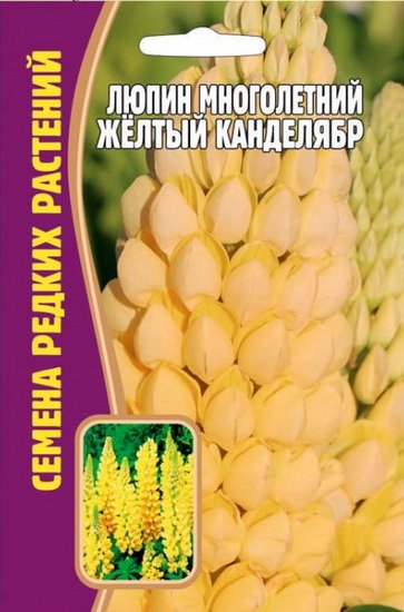 Люпин многолетний Жёлтый Канделябр. Многолетнее, неприхотливое, светолюбивое, зимостойкое растение, высотой до 100 см. Листья крупные, соцветия гигантские цилиндрические кисти жёлтого цвета, длиной 40-50 см.