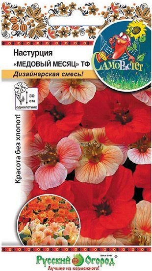 Настурция Медовый месяц ТФ – восхитительный экземпляр цветочной декоративной флоры, способный украсить собой любую, даже самую непримечательную местность, или серое помещение. Отличается эта смесь гармоничным сочетанием аккуратных цветков ярко-оранжевого и светло-розового окраса. Высота растения – 30 сантиметров, что делает его идеальным кандидатом для создания декоративных цветочных бордюров.