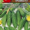 Огурец Сибирская тройка - высокопродуктивный партенокарпический гибрид раннего срока созревания. Для весенних теплиц и пленочных туннелей. От всходов до начала плодоношения 45-48 дней. Растения сильнорослые, исключительно женского типа цветения, с букетным заложением завязей – до 3 шт в узле. Зеленцы корнишонного типа, короткоплодные – 7-9 см, крупнобугорчатые, белошипые, массой в среднем 70 г. Огурчики плотные, хрустящие, без горечи. Сохраняют отличный внешний вид до трех недель после сбора. Используются для свежего потребления и консервирования. Гибрид устойчив к кладоспориозу и настоящей мучнистой росе, толерантен к пероноспорозу. Урожайность в теплицах 10-12 кг/ м2(в т. ч. ранняя 6-7 кг), в туннелях 4,5-5 кг/ м2.