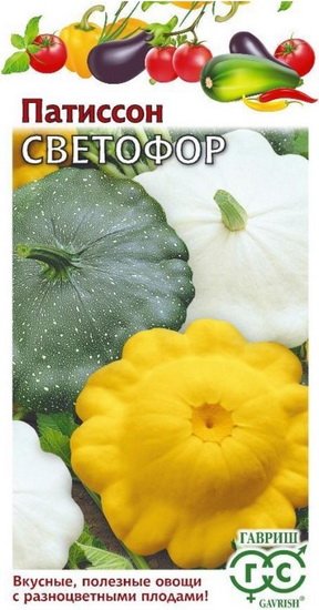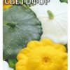 Яркая смесь патиссонов из сортов, растения кустовые, не ветвящееся. Плоды тарелочной формы, с зубчатыми краями, белого, желтого и зеленого цветов гладкие, массой 250-300 г.