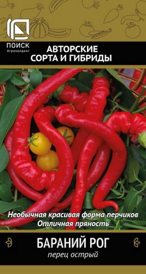Раннеспелый высокоурожайный сорт: 100-105 дней от всходов до начала плодоношения. Для открытого и защищенного грунта, временных пленочных укрытий. Куст высотой 50-60 см. Плоды узкоконусовидные, длинные, скручены по спирали и похожи на бараний рог, пикантного острого вкуса, очень ароматные. Окраска незрелых плодов светло-зеленая, зрелых – светло-красная.
