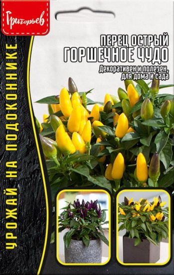 Горшечный, раннеспелый сорт кустарникового перца. Куст высотой 20-30 см, компактный, не требует формирования. Подходит для выращивания в горшках. Плод конусовидный, длиной 2-3 см, направлен вверх. Масса плода 4-6 г, толщина стенки 2-3 мм. Окраска плодов в технической спелости жёлтая, переходящая в фиолетовую. Ароматные плоды острого вкуса используют при засолке огурцов и томатов, в качестве приправы к блюдам, для изготовления порошка и консервирования. Декоративный перец прекрасно себя чувствует как на участке, так и в комнатных условиях. Причем дома эту культуру можно выращивать в качестве многолетней.