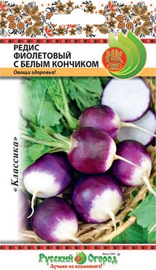 Среднеспелый (25-35 дней) высокоурожайный сорт фиолетового редиса с миниатюрным белым хвостиком.