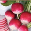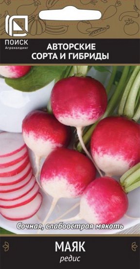 От всходов до начала уборки 25-30 дней. Розетка листьев средней высоты. Корнеплод округлый, розово-красный с белым кончиком. Мякоть белая, сочная, средней остроты. Масса товарного корнеплода 20-24 г. Урожайность 2,5-3,5 кг/м2