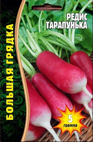 Редис Тарапунька - ультраранний (16-20 дней от всходов до технической спелости) сорт. Цвет корнеплода варьируется от розовато-красного до ярко-красного с белым кончиком. Форма — овально-цилиндрическая.