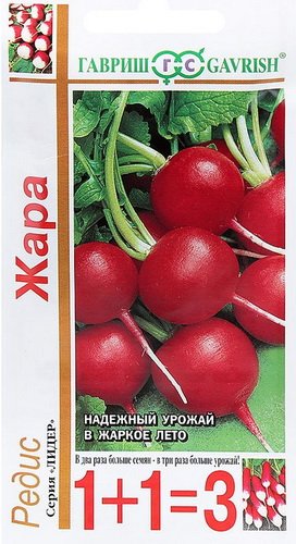 Урожайность редиса высокая, до 3,5 кг/м. кв. Розетка у редиса Жара раскидистая, но листьев, при правильном выращивании немного. Корнеплод округлый, красно-малинового цвета, не очень большой, весом 13-30 гр. Примерная длина корнеплода 4-5 см, а диаметр 3-3,5 см. Поверхность гладкая с легким блеском.