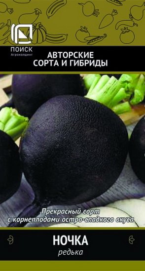 Период от всходов до уборки урожая 70-95 дней. Корнеплод черный, округлый, длиной 8-12 см, диаметром 9-13 см. Поверхность слегка бороздчатая. Мякоть белая, плотная, сочная, остро-сладкого вкуса. Масса 230-350 г. В почву погружен полностью, легко выдергивается. Розетка полураскидистая.