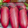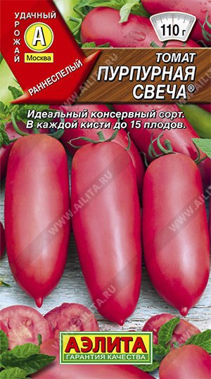 Томат Пурпурная свеча - Раннеспелый сорт с обильным плодоношением. Плоды созревают на 105-110 день от массовых всходов. Растения индетерминантные, высотой 1,7 м, средне облиственные, плоды в сложных кистях по 8-12 штук. Первая кисть закладывается над 6-7-м листом, последующие – через 2 листа. Плоды длинные, цилиндрической формы с «носиком», массой 60-110 г, малиновые.