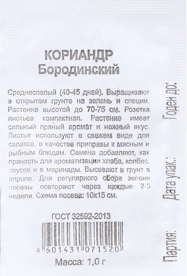 Среднеспелый сорт, предназначенный для использования зелени в свежем виде в салатах, гарнирах, соусах и приготовления пряных приправ из семян. От полных всходов до уборки на зелень (начало фазы стеблевания) – 35-45 дней, до созревания семян – 80-90 дней.