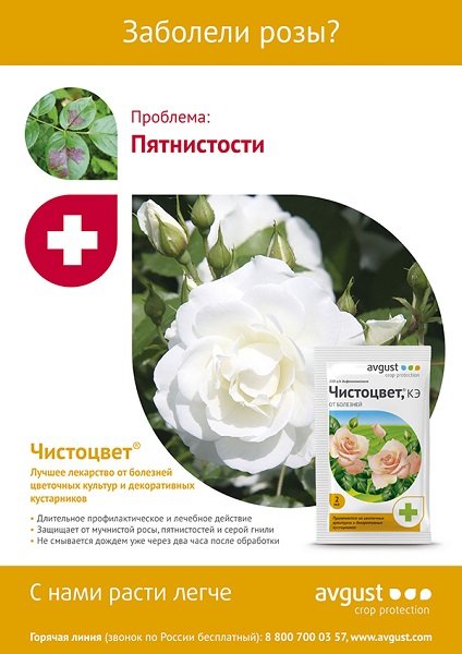 Препарат «Чистоцвет» относится к системным фунгицидам нового поколения. Его основным действующим веществом является дифеноконазол, позволяющий быстро справиться с болезнями даже в наиболее неблагоприятные сезоны. «Чистоцвет» эффективно подавляет грибные заболевания растений: серую гниль, пятнистость, мучнистую росу. Препарат имеет защитные, лечебные и иммунизирующие свойства, не смывается дождем, устойчив к неблагоприятным погодным условиям.