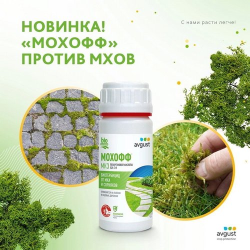 Биопрепарат "Мохофф" легко справляется с такими проблемами как мхи, лишайники и нежелательной травянистой растительностью на газонах, садовых дорожках, отмостках, швах плитки и т.д.