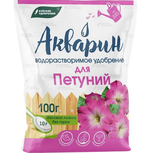 "Акварин" для петуний - водорастворимое удобрение, в состав которого входит азот, фосфор, калий, магний, сера и микроэлементы – железо, цинк, марганец, медь в хелатной форме, а бор и молибден – в минеральной.