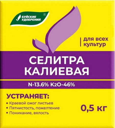 Селитра калиевая (нитрат калия) – широко востребованное азотно-калийное удобрение, в состав которого включено 13% азота и 45 – 46% калия.