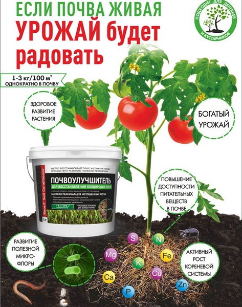 Почвенный кондиционер, быстро повышающий химико-физические и биологические свойства почвы, эффективный мелиорант почвы.