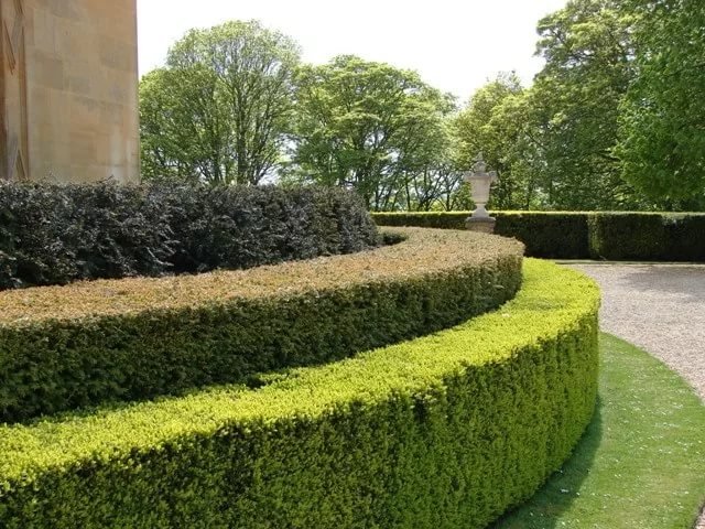 В многорядных изгородях хорошо смотрятся растения с контрастной окраской листвы. Также прекрасным решением является сочетание лиственных и хвойных растений.